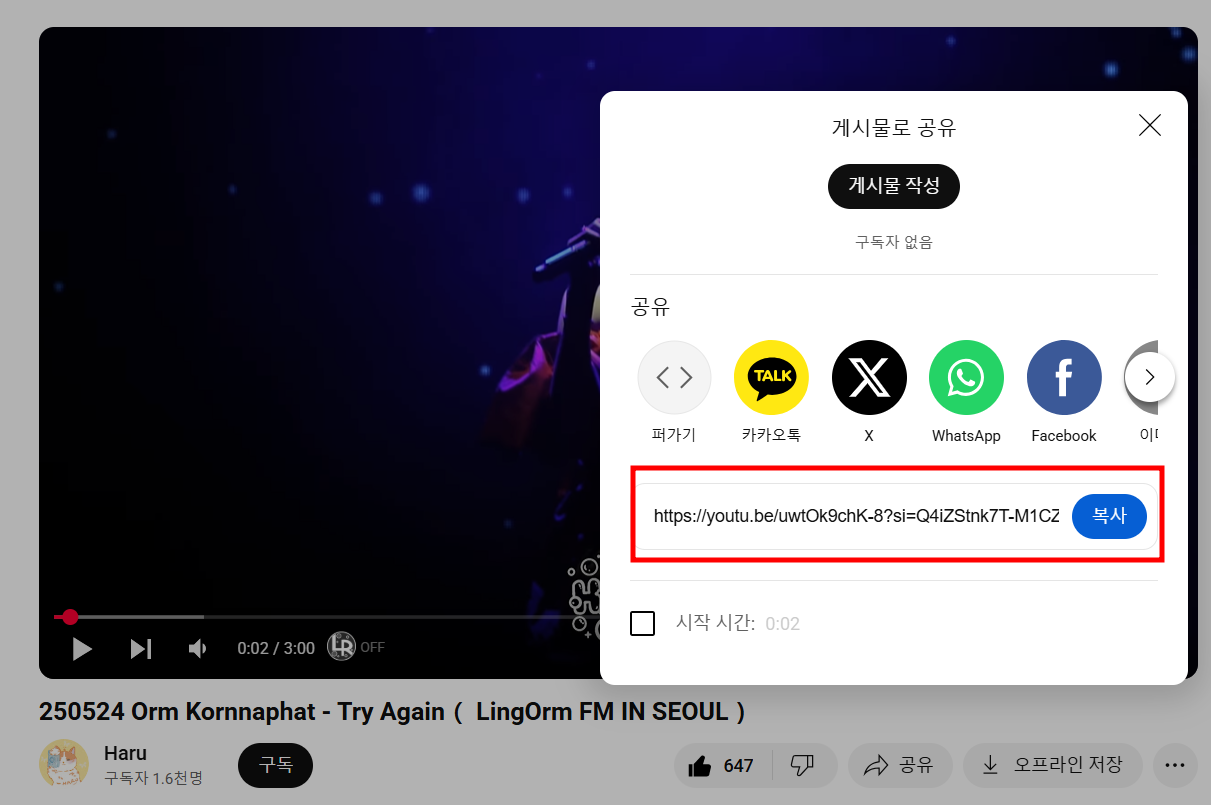 음원 추출을 희망하는 동영상을 확인해준 후 게시글 공유 버튼을 누르고 해당 동영상의 링크를 복사해줍니다.