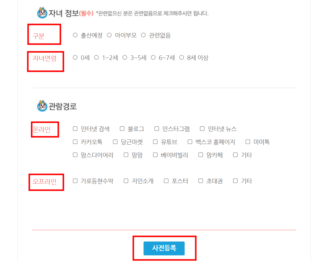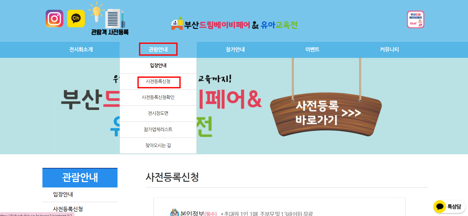 메인 화면에서 관람 안내 -> 사전등록 신청란으로 이동하셔도 됩니다.